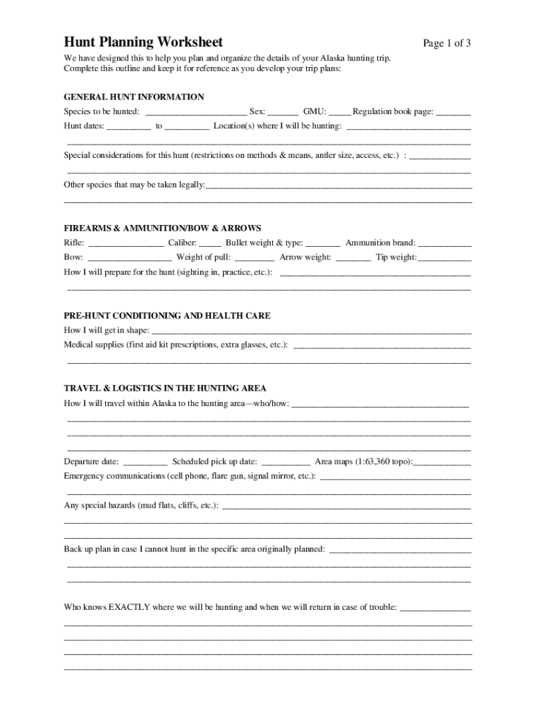 Hunt Planning Worksheet Page 1 of 3We have designed this to help you plan and organize the details of your Alaska hunting trip. Complete this outline and keep it for reference as you develop your