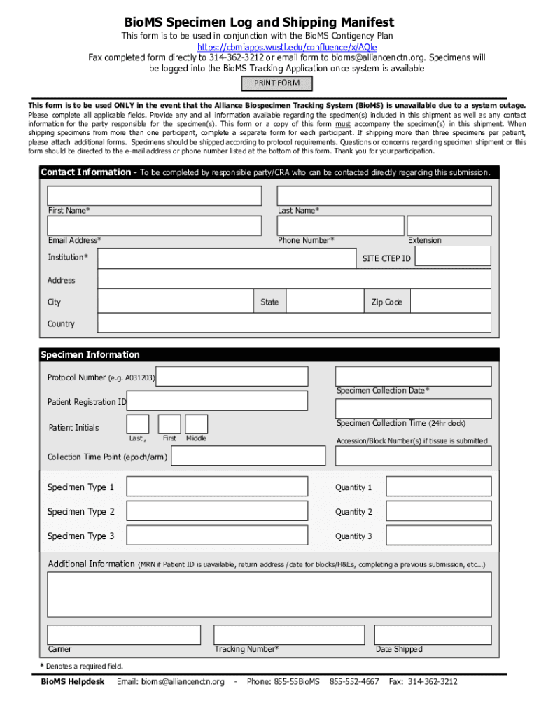BIOS Specimen Log and Shipping Manifest This form is to be used in conjunction with the BIOS Contingency Plan https://cbmiapps.wustl.edu/confluence/x/AQle Fax completed form directly to 3143623212