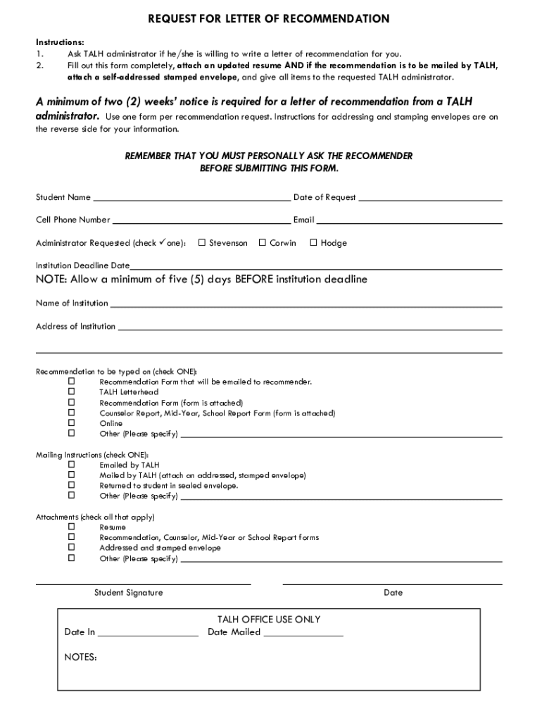 REQUEST FOR LETTER OF RECOMMENDATION Instructions: 1. Ask TALK administrator if he/she is willing to write a letter of recommendation for you. 2. Fill out this form completely, attach an updated resume