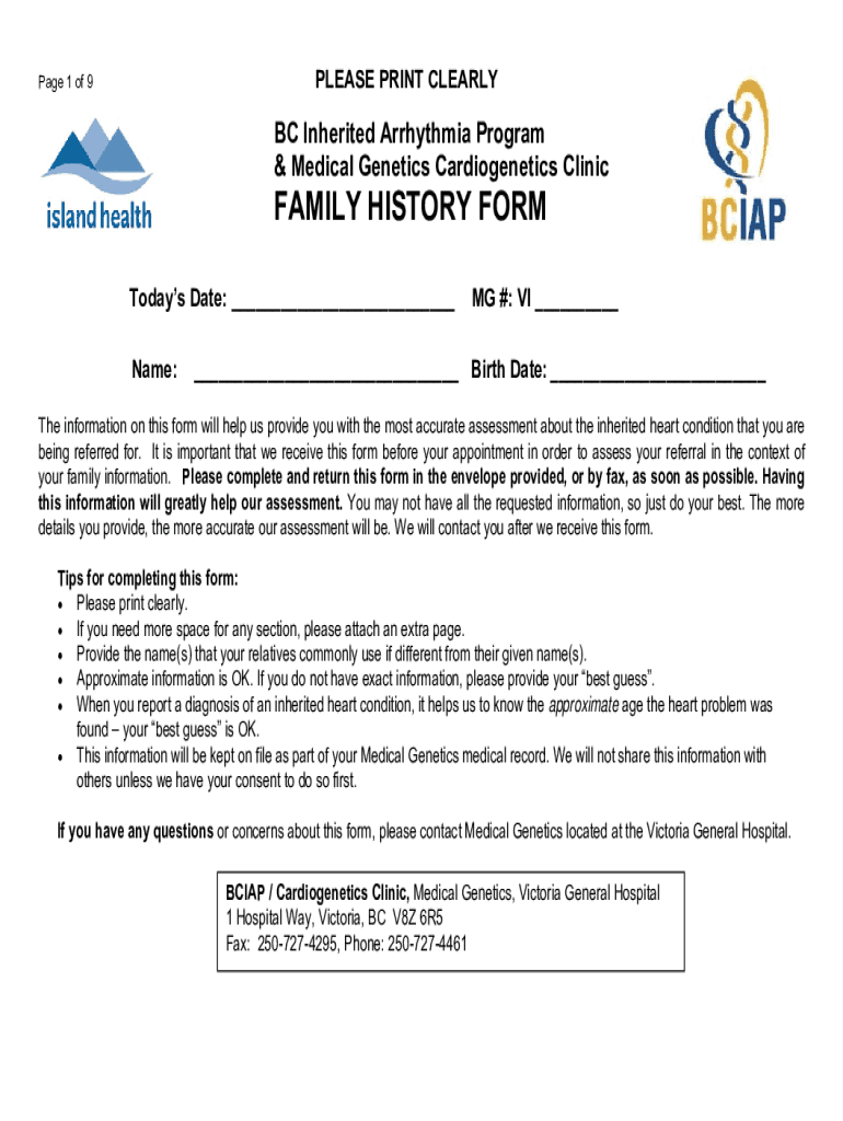 PLEASE PRINT CLEARLY Page 1 of 9BC Inherited Arrhythmia Program & Medical Genetics Cardio genetics Clinically HISTORY FORM Today's Date: ___ Name:MG #: VI ______ Birth Date: ___The information on