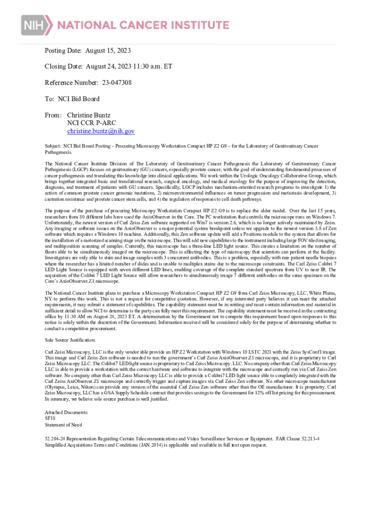 Posting Date: August 15, 2023, Closing Date: August 24, 2023 11:30 a.m. ET Reference Number: 23047308 To: NCI Bid Board From: Christine Bunt NCI CCR PARC christine.buntz@nih.gov Subject: NCI Bid Board