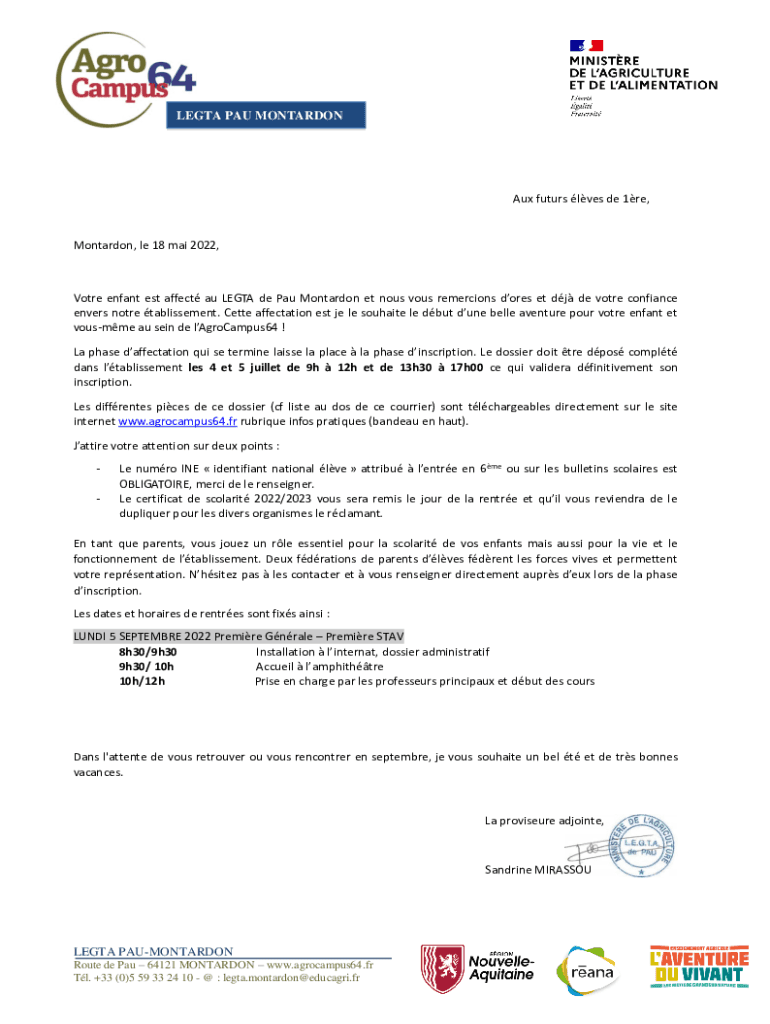 Une fois le dossier d'inscription complet, envoyez-le par courrier ou déposez-le directement au secrétariat du lycée agricole de Pau-Montardon.