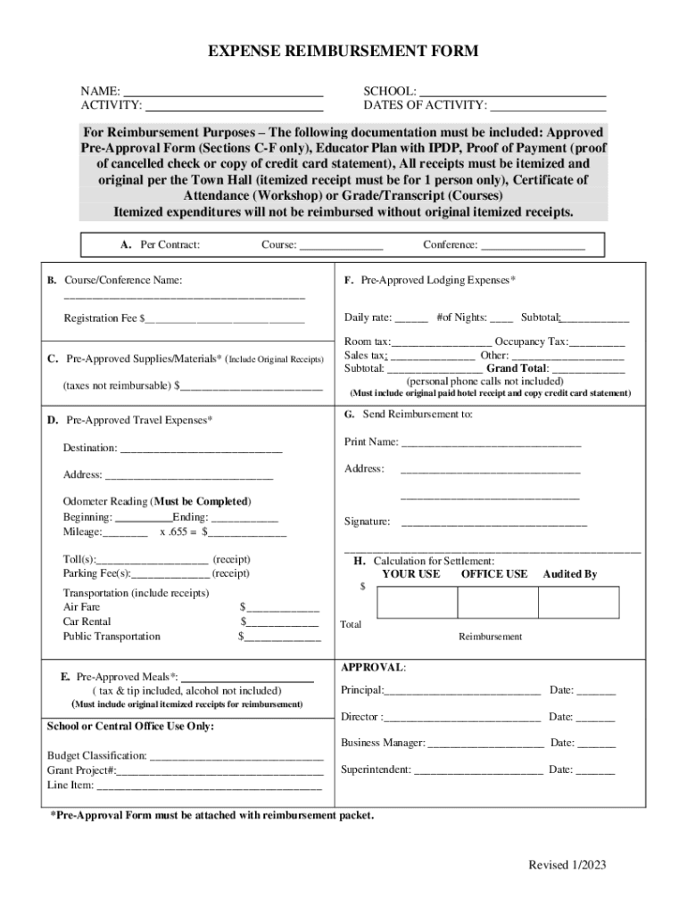 EXPENSE REIMBURSEMENT FORM NAME: ACTIVITY:SCHOOL: DATES OF ACTIVITY:For Reimbursement Purposes The following documentation must be included: Approved PreApproval Form (Sections CF only), Educator