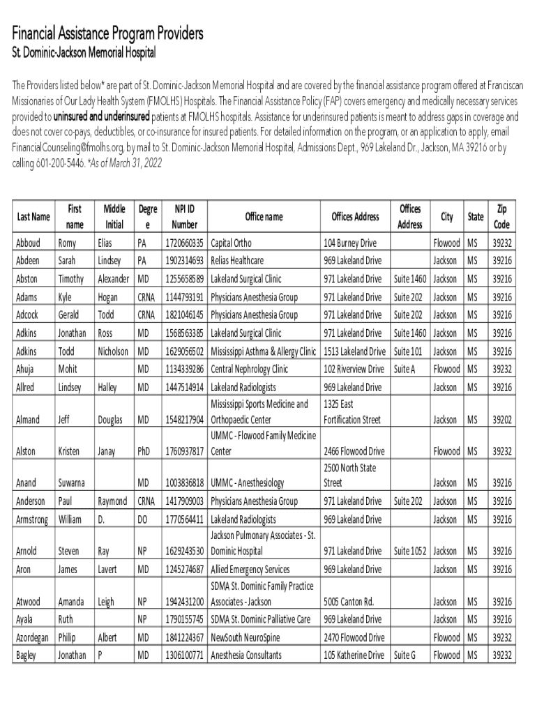 Financial Assistance Program Providers St. Dominic Jackson Memorial Hospital The Providers listed below* are part of St. Dominic Jackson Memorial Hospital and are covered by the financial assistance