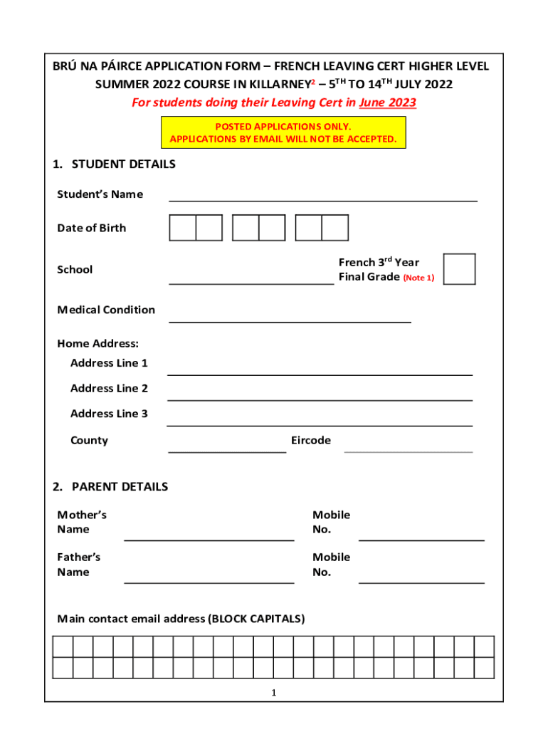 BR NA PIECE APPLICATION FORM FRENCH LEAVING CERT HIGHER LEVEL SUMMER 2022 COURSE IN KILLARNEY2 5TH TO 14TH JULY 2022 For students doing their Leaving Cert in June 2023 POSTED APPLICATIONS ONLY. APPLICATIONS