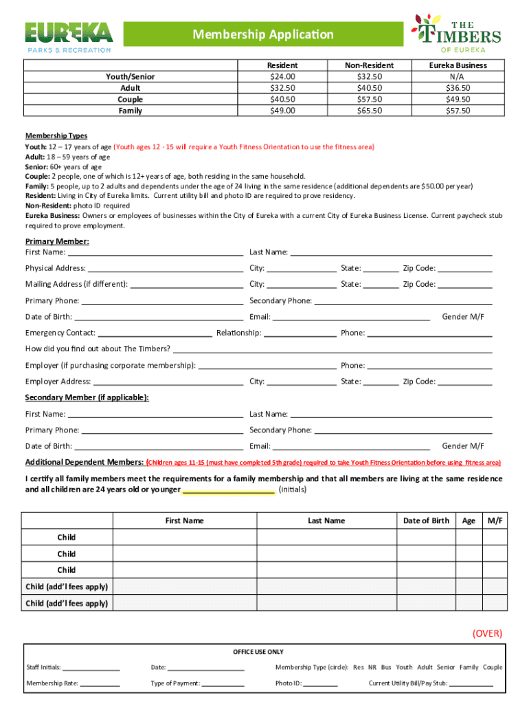 Membership Application Resident $$$24.0032.50$40.5049.00Youth/Senior Adult Couple FamilyNonResident $$$32.5040.50$57.5065.50Eureka Business N/A $$$36.5049.5057.50Membership Types Youth: 12 17 years