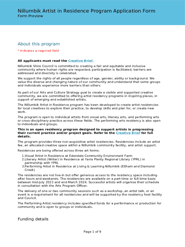 Get the free Nillumbik Artist in Residence Program Application Form