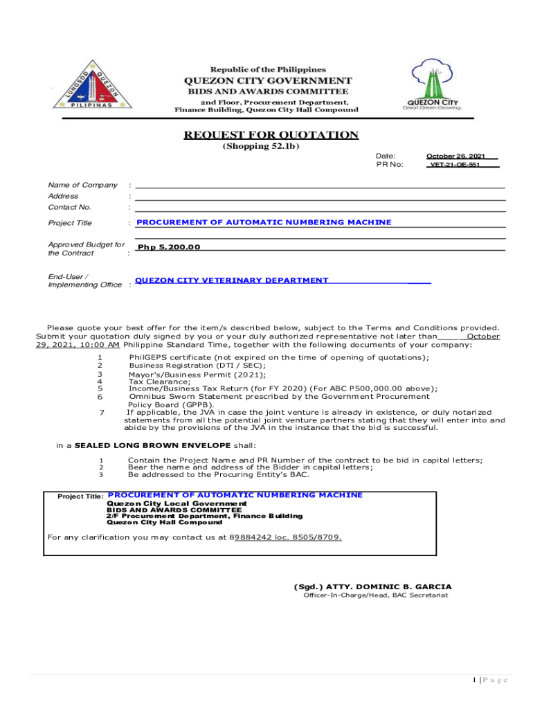 2nd Floor, Procurement Department, Finance Building, Quezon City Hall CompoundREQUEST FOR QUOTATION (Shopping 52.1b) Date: PR No: Name of Company:Address:Contact No.:Project Title: PROCUREMENT OF