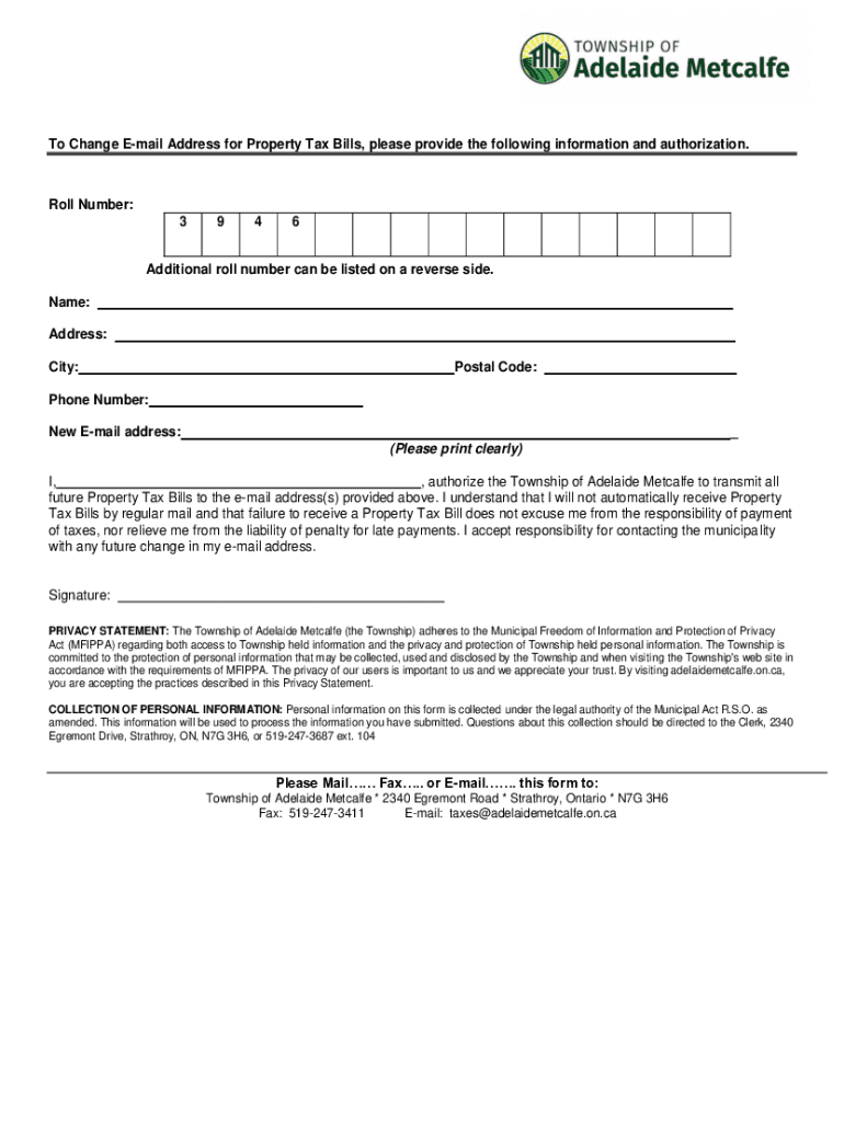 To Change Email Address for Property Tax Bills, please provide the following information and authorization. Roll Number: 3946Additional roll number can be listed on a reverse side. Name: Address: