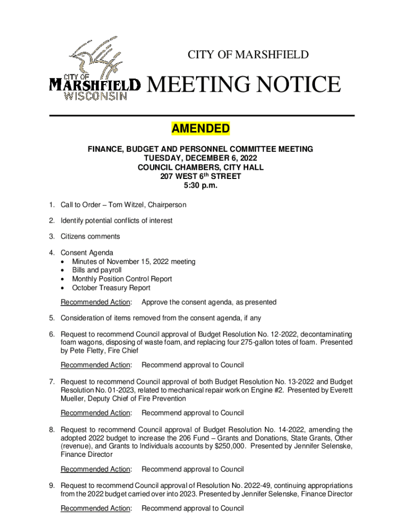 CITY OF MARSHFIELDMEETING NOTICE AMENDED FINANCE, BUDGET AND PERSONNEL COMMITTEE MEETING TUESDAY, DECEMBER 6, 2022, COUNCIL CHAMBERS, CITY HALL 207 WEST 6th STREET 5:30 p.m. 1. Call to Order Tom Wetzel,