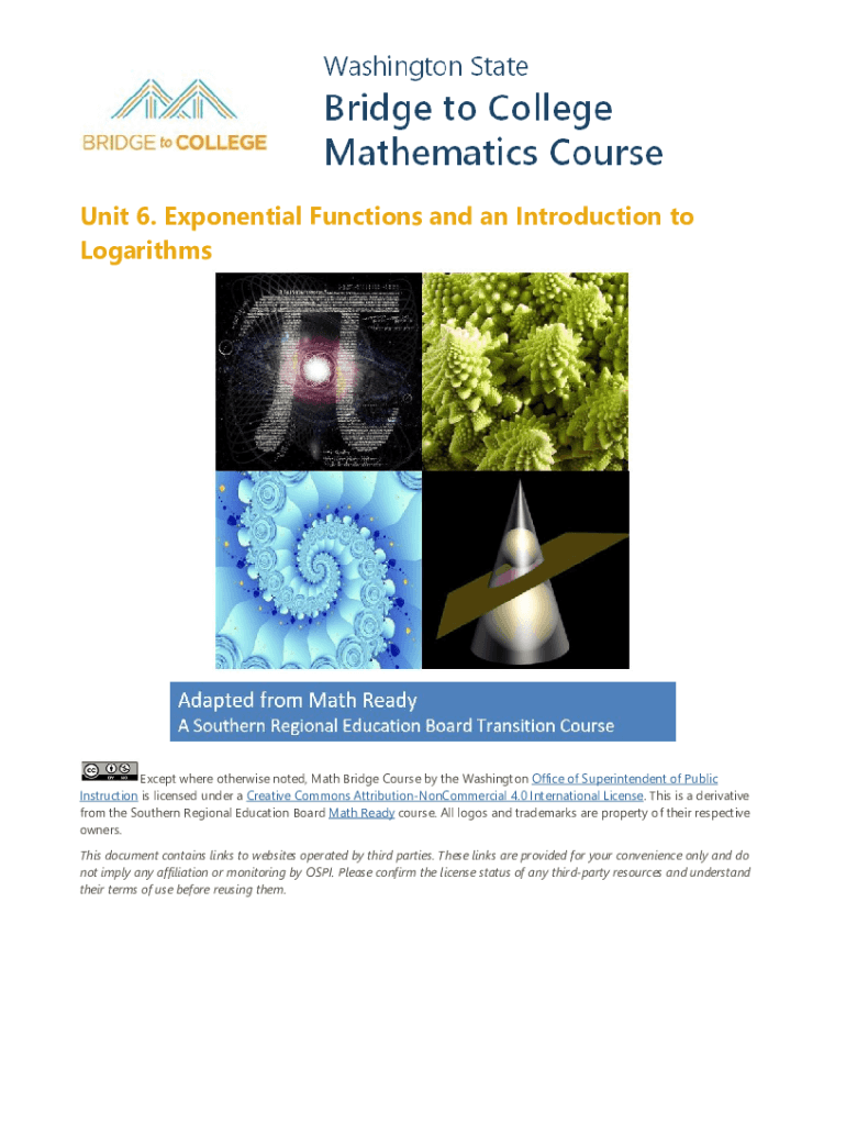 Unit 6. Exponential Functions and an Introduction to LogarithmsExcept where otherwise noted, Math Bridge Course by the Washington Office of Superintendent of Public Instruction is licensed under a