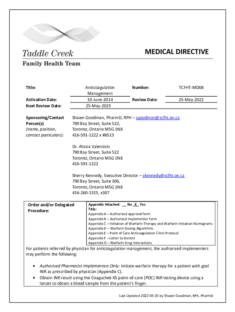 MEDICAL DIRECTIVETitle:Anticoagulation Management 10June2014 25May2023Activation Date: Next Review Date: Sponsoring/Contact Person(s) (name, position, contact particulars):Number:TCFHTMD08Review Date:25May2022Shawn