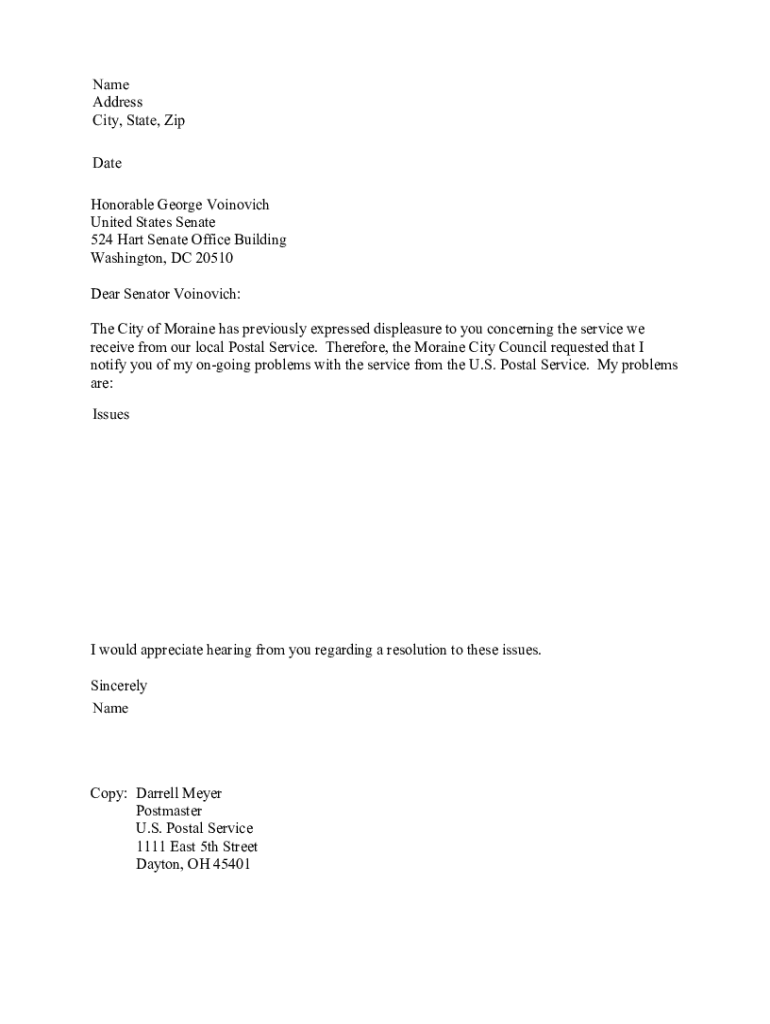 Name Address City, State, Update Honorable George Ivanovich United States Senate 524 Hart Senate Office Building Washington, DC 20510 Dear Senator Ivanovich: The City of Moraine has previously expressed