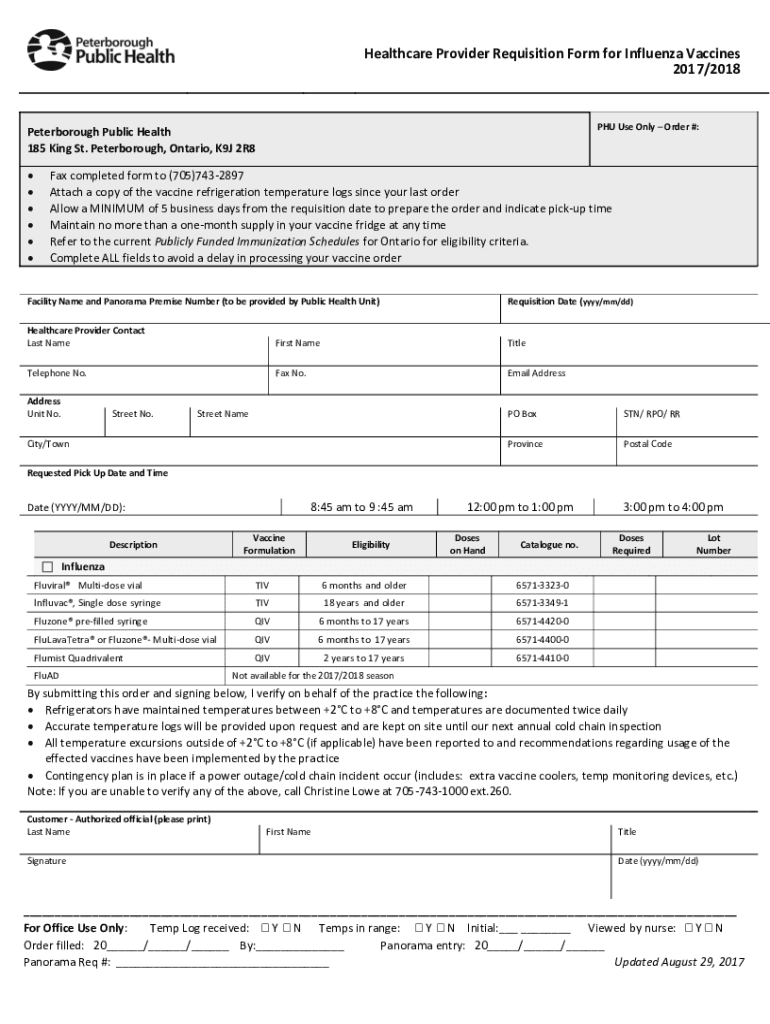 Healthcare Provider Requisition Form for Influenza Vaccines 2017/2018PHU Use Only Order #:Peterborough Public Health 185 King St. Peterborough, Ontario, K9J 2R8 Fax completed form to (705)7432897