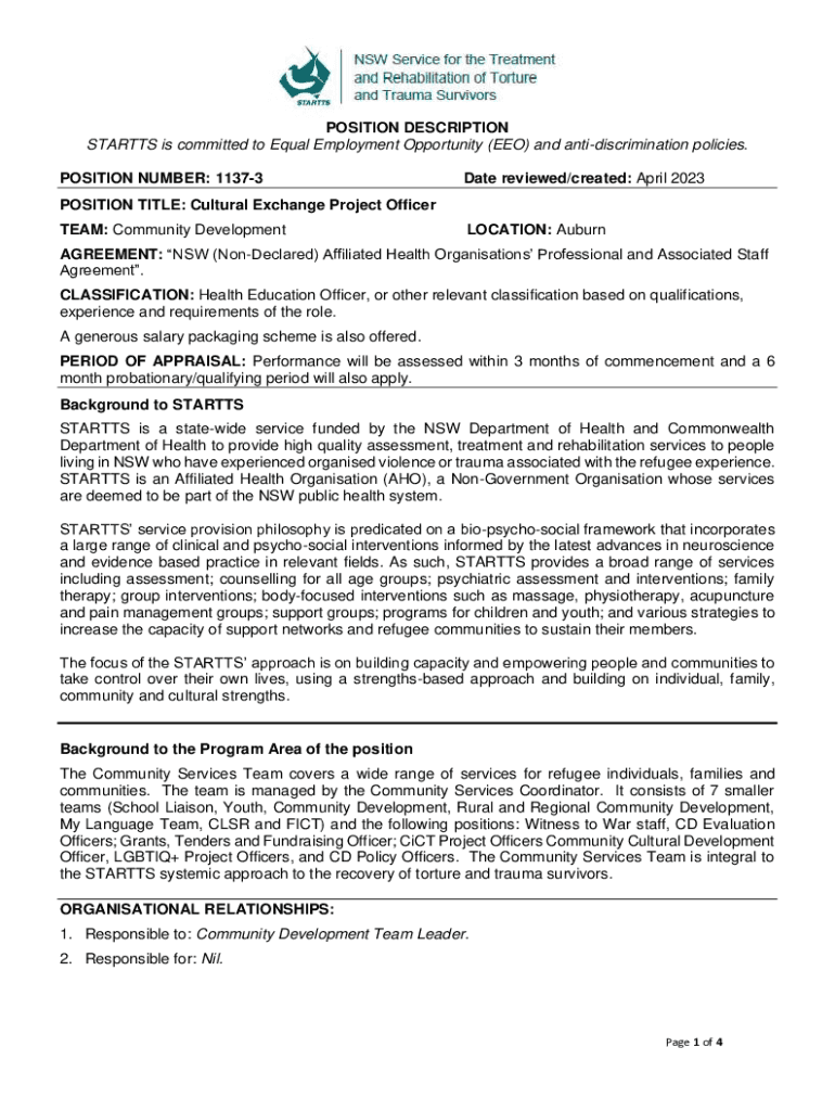 POSITION DESCRIPTION STARTS is committed to Equal Employment Opportunity (EEO) and antidiscrimination policies. POSITION NUMBER: 11373Date reviewed/created: April 2023POSITION TITLE: Cultural Exchange