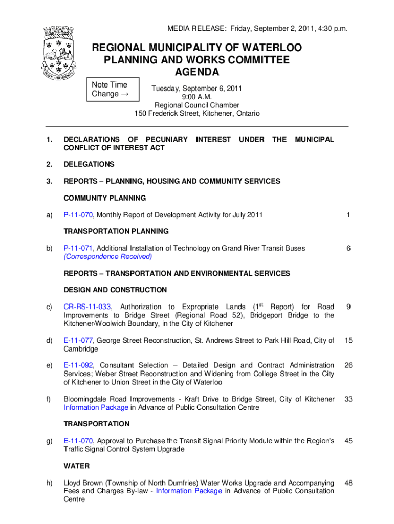 MEDIA RELEASE: Friday, September 2, 2011, 4:30 p.m.REGIONAL MUNICIPALITY OF WATERLOO PLANNING AND WORKS COMMITTEE AGENDA Note Time Change Tuesday, September 6, 2011 9:00 A.M. Regional Council Chamber