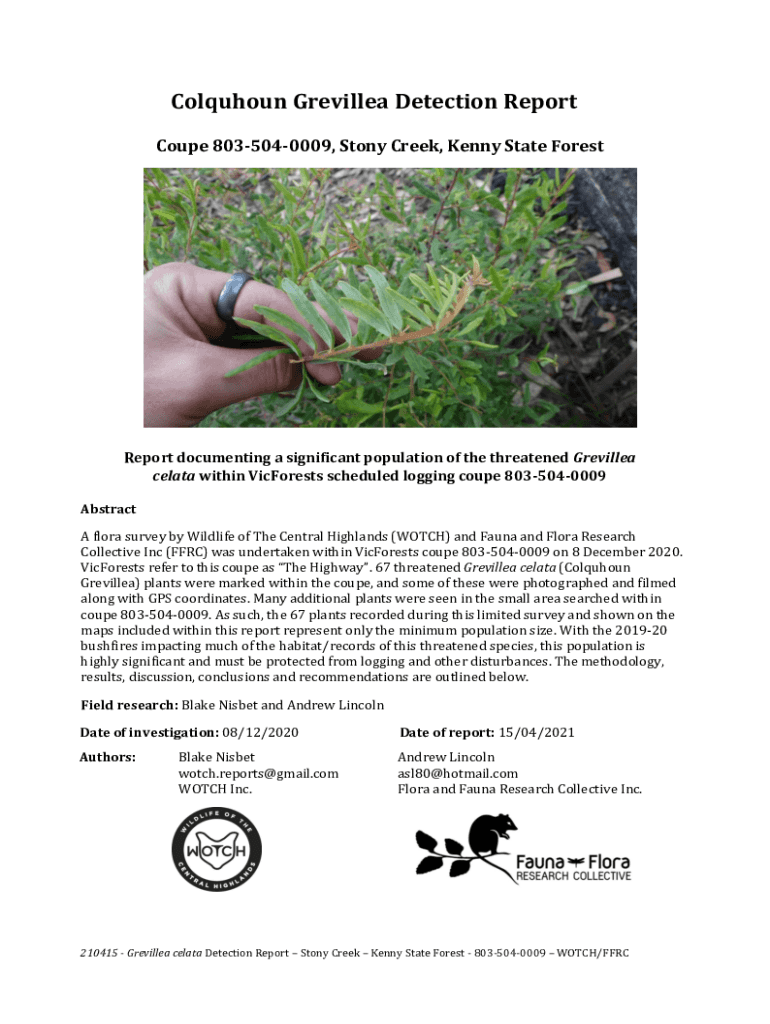 Calhoun Grenville Detection Report Coupe 8035040009, Stony Creek, Kenny State ForestReport documenting a significant population of the threatened Grenville CELTA within Forests scheduled logging coupe