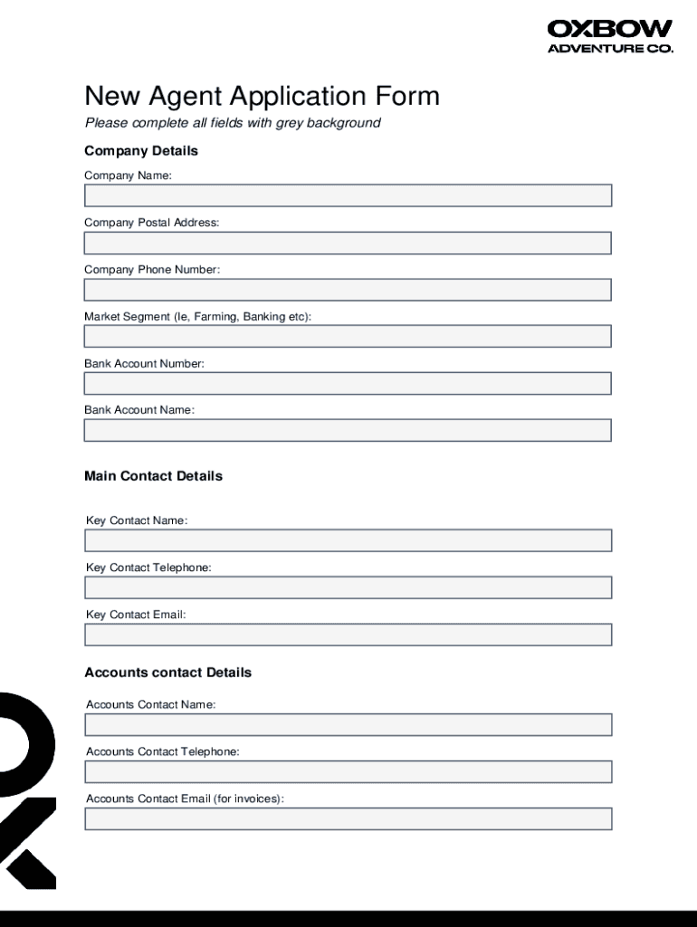 New Agent Application Form Please complete all fields with gray background Company Details Company Name:Company Postal Address:Company Phone Number:Market Segment (IE, Farming, Banking etc): IE, Farming,