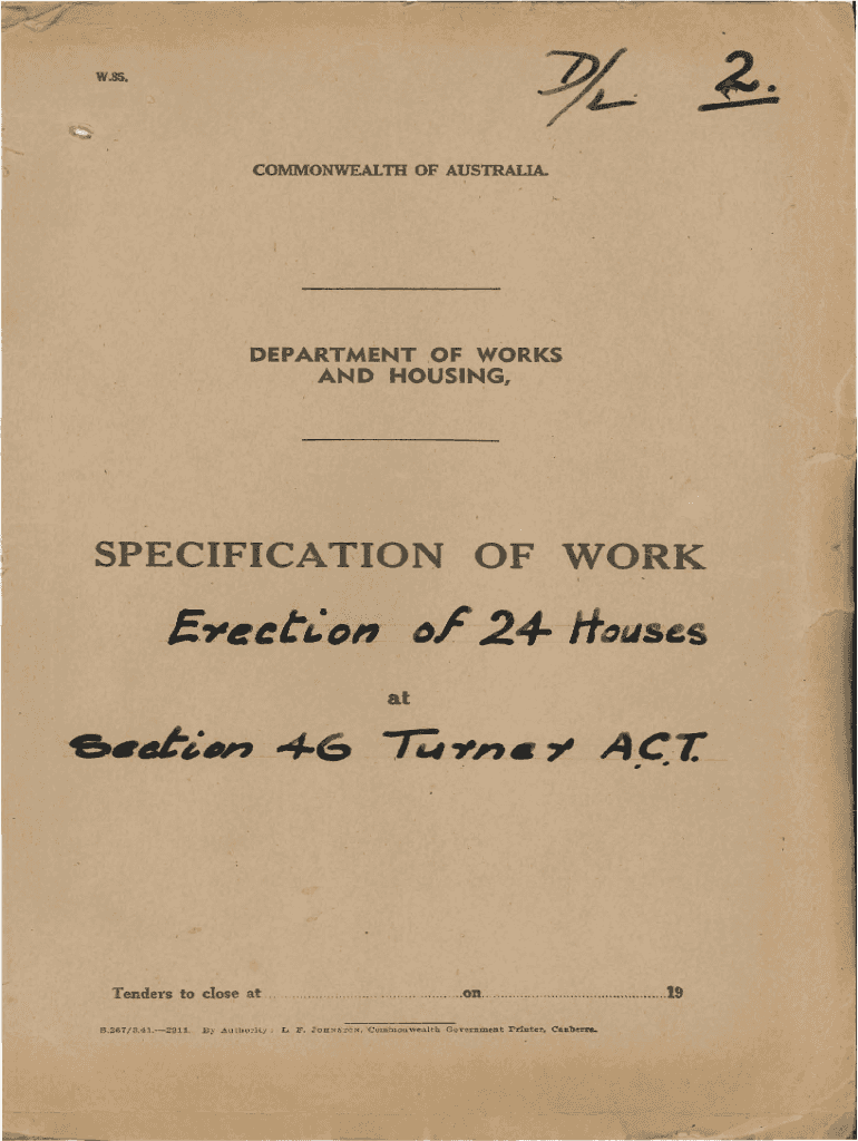 W.SS.Col\'IMONWEALlH OF AUSTRALIA.DEPARTMENT OF WORKS AND HOUSING, SPECIFICATION OF WORK.,ct1.\”011tF. 24 H\”uses attenders to close at. . ............... ..... ............. ... ...on.............................................