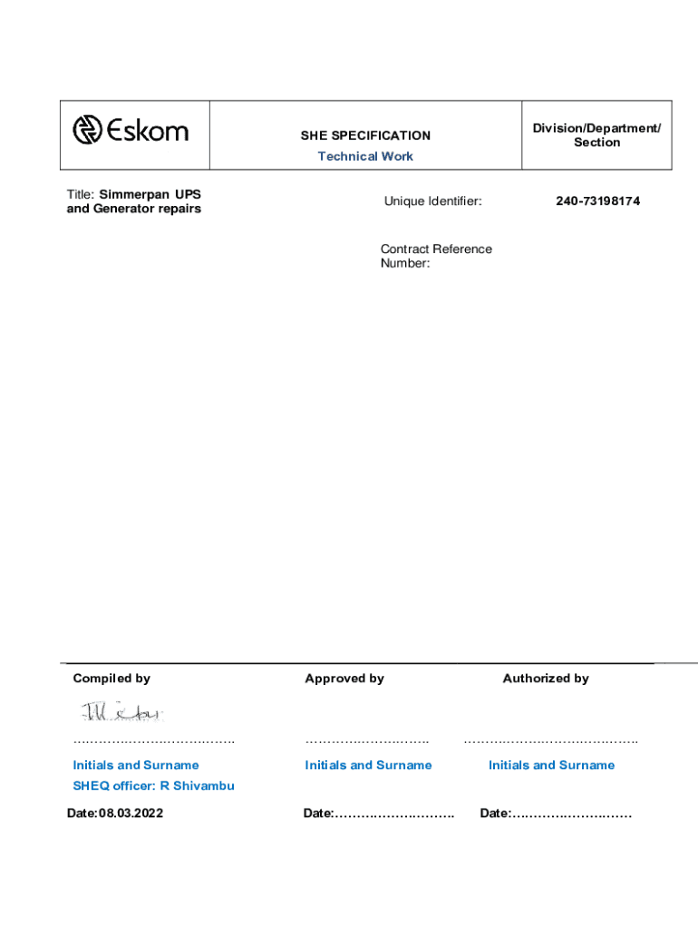 Division/Department/ Sections SPECIFICATION Technical Work Title: Simmer pan UPS and Generator repairs24073198174Unique Identifier:Contract Reference Number:Compiled approved authorized by...... Initials