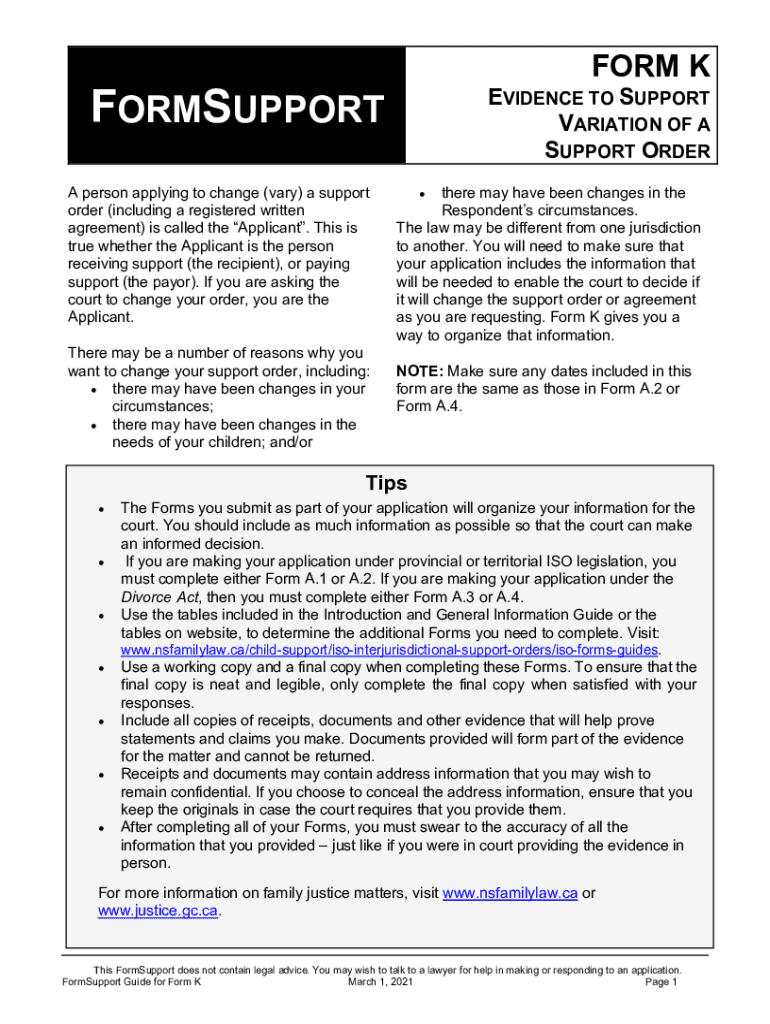 FORM KFORMSUPPORT A person applying to change (vary) a support order (including a registered written agreement) is called the Applicant. This is true whether the Applicant is the person receiving