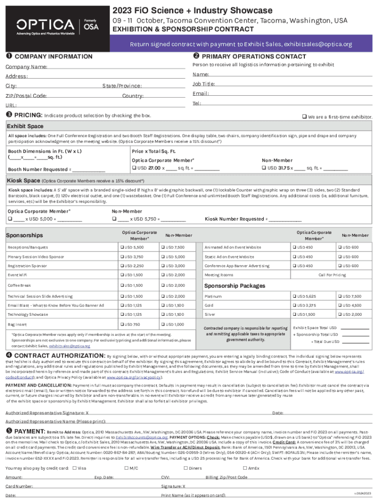 EXHIBITION & SPONSORSHIP CONTRACTReturn signed contract with payment to Exhibit Sales, exhibitsales@optica.org