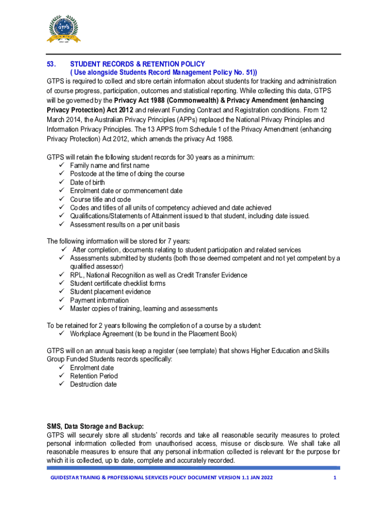 53.STUDENT RECORDS & RETENTION POLICY (Use alongside Students Record Management Policy No. 51)) GPS is required to collect and store certain information about students for tracking and administration