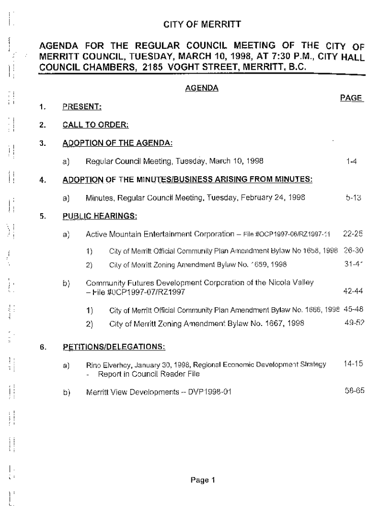 CITY OF MERRITT:AGENDA FOR THE REGULAR COUNCIL MEETING OF THE CITY OF MERRITT COUNCIL, TUESDAY, MARCH 10, 1998, AT 7:30 P.M., CITY HALL COUNCIL CHAMBERS, 2185 VO GHT STREET, MERRITT, B.C. AGENDA PAGE1.PRESENT:2.CALL