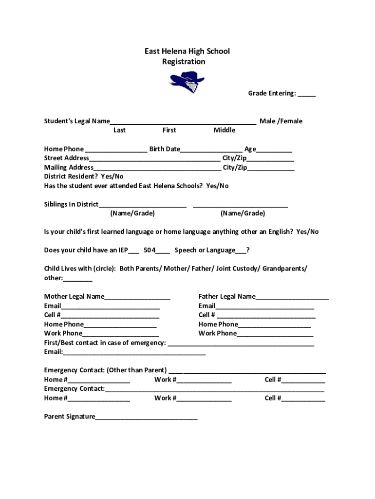 East Helena High School Registration Grade Entering: ___ Student\'s Legal Name___ Male /Female Last First Middle Home Phone ___ Birth Date___ Age___ Street Address___ City/Zip___ Mailing Address___