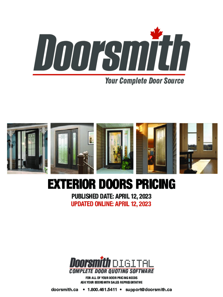Your Complete Door SourceEXTERIOR DOORS PRICING PUBLISHED DATE: APRIL 12, 2023, UPDATED ONLINE: APRIL 12, 2023COMPLETE DOOR QUOTING SOFTWARE FOR ALL OF YOUR DOOR PRICING NEEDS ASK YOUR GOLDSMITH SALES