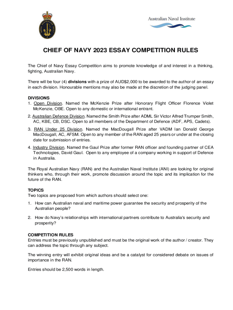 CHIEF OF NAVY 2023 ESSAY COMPETITION RULES The Chief of Navy Essay Competition aims to promote knowledge of and interest in a thinking, fighting, Australian Navy. There will be four (4) divisions