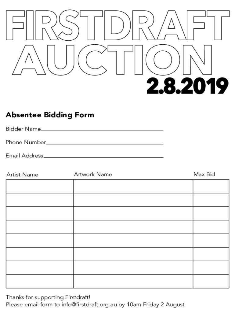 2.8.2019 Absentee Bidding Forbidden Name Phone Number Email Address Artist Camerawork Nathans for supporting First draft! Please email form to info@firstdraft.org.au by 10am Friday 2 August Max Bid.