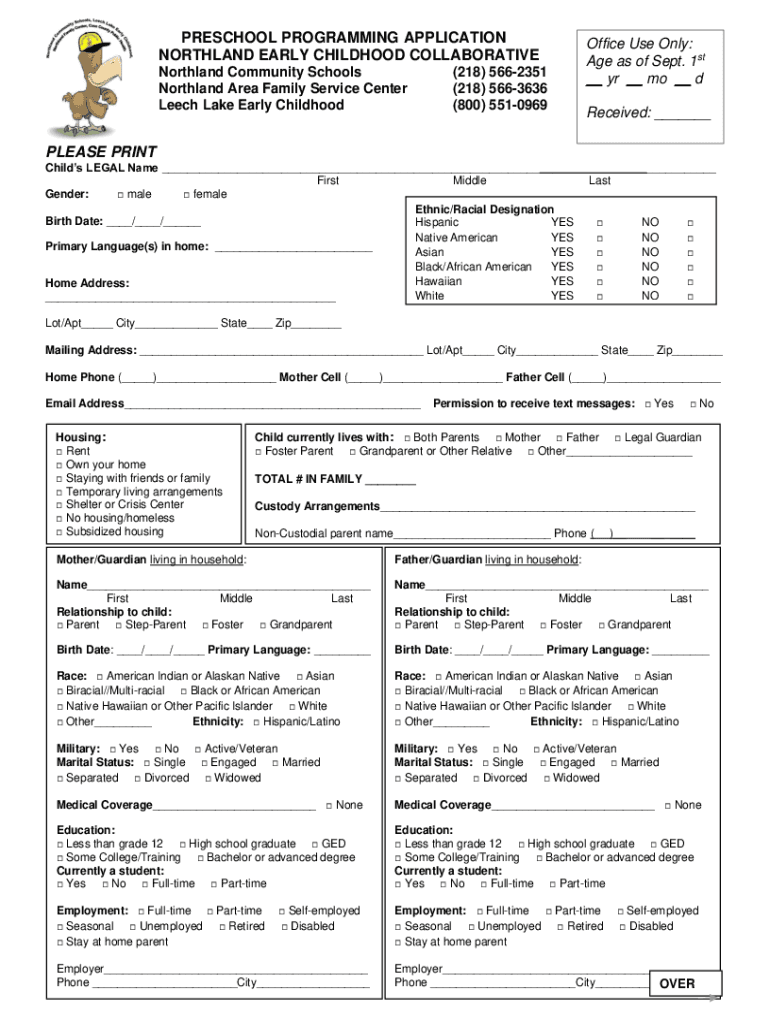PRESCHOOL PROGRAMMING APPLICATION NORTHLAND EARLY CHILDHOOD COLLABORATIVE Northland Community Schools Northland Area Family Service Center Leech Lake Early Childhood(218) 5662351 (218) 5663636 (800)