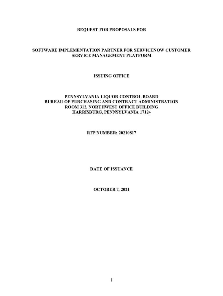 REQUEST FOR PROPOSALS SOFTWARE IMPLEMENTATION PARTNER FOR ServiceNow CUSTOMER SERVICE MANAGEMENT PLATFORMISSUING OFFICEPENNSYLVANIA LIQUOR CONTROL BOARD BUREAU OF PURCHASING AND CONTRACT ADMINISTRATION