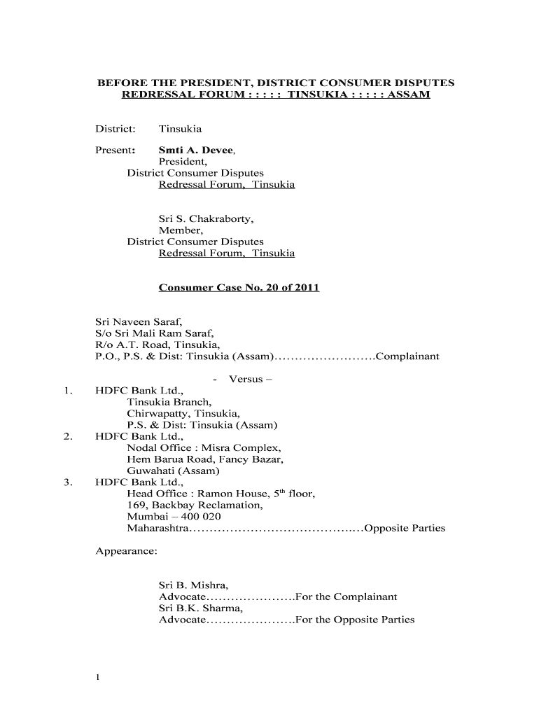BEFORE THE PRESIDENT, DISTRICT CONSUMER DISPUTES Reparation FORUM : : : : : INSULIN : : : : : ASSAM District:TinsukiaPresent:SMTP A. Levee, President, District Consumer Disputes Reparation Forum,