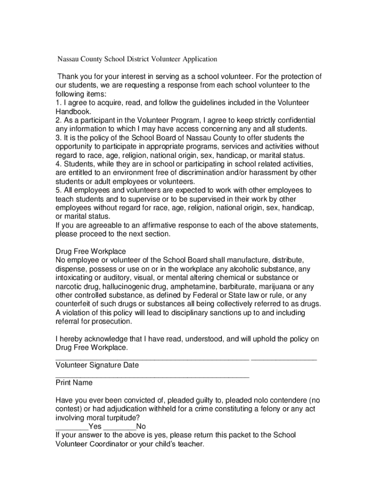 Nassau County School District Volunteer Application Thank you for your interest in serving as a school volunteer. For the protection of our students, we are requesting a response from each school