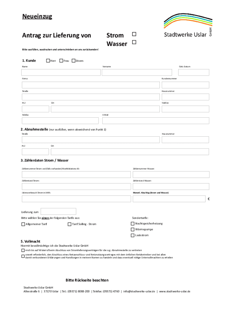 Holen Sie sich kostenlos Neueinzug Antrag zur Lieferung von Strom Wasser