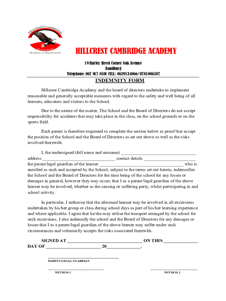 HILLCREST CAMBRIDGE ACADEMY 19 Harley Street Corner Oak Avenue Sandburg Telephone: 067 817 0501 CELL: 0629534866/0785006587INDEMNITY FORM Hillcrest Cambridge Academy and the board of directors undertakes