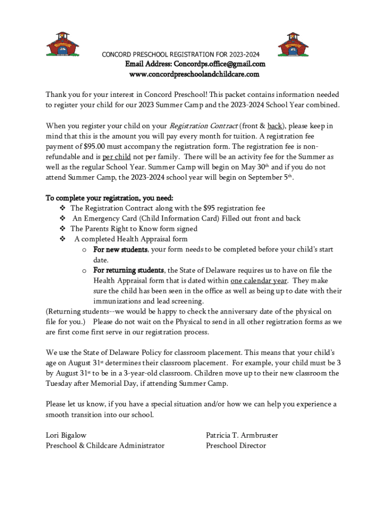 CONCORD PRESCHOOL REGISTRATION FOR 20232024Email Address: Concordps.office@gmail.com www.concordpreschoolandchildcare.com Thank you for your interest in Concord Preschool! This packet contains information