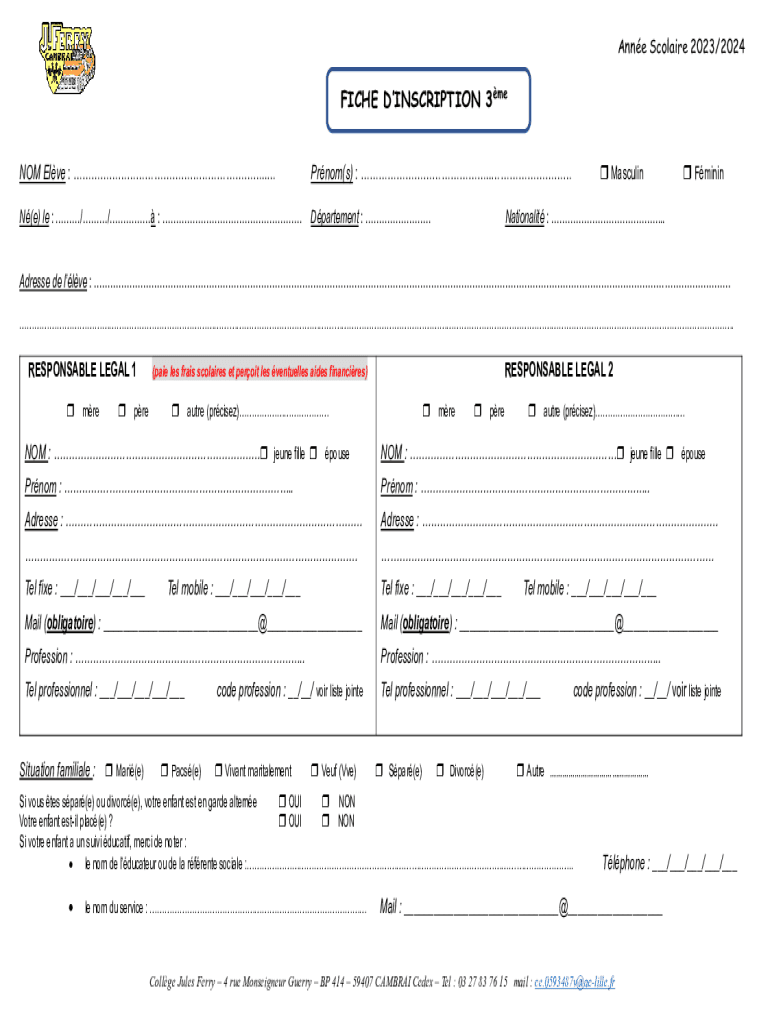 Obtenir le gratuit FICHE D'INSCRIPTION 3me