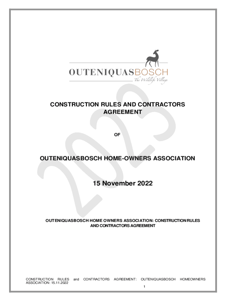 AGREEMENTOFOUTENIQUASBOSCH HOMEOWNERS ASSOCIATION15 November 2022OUTENIQUASBOSCH homeowners ASSOCIATION: CONSTRUCTION RULES