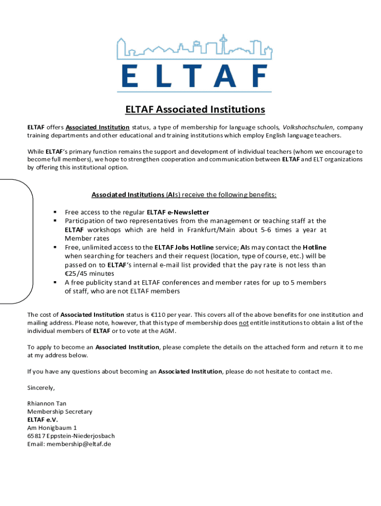 ELT AF Associated Institutions ELT AF offers Associated Institution status, a type of membership for language schools, Volkshochschulen, company training departments and other educational and training