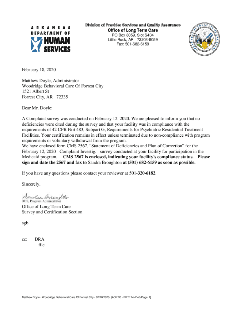 Division of Provider Services and Quality AssuranceOffice of Long Term Care PO Box 8059, Slot S404 Little Rock, AR 722038059 Fax: 5016826159February 18, 2020 Matthew Doyle, Administrator Woodridge
