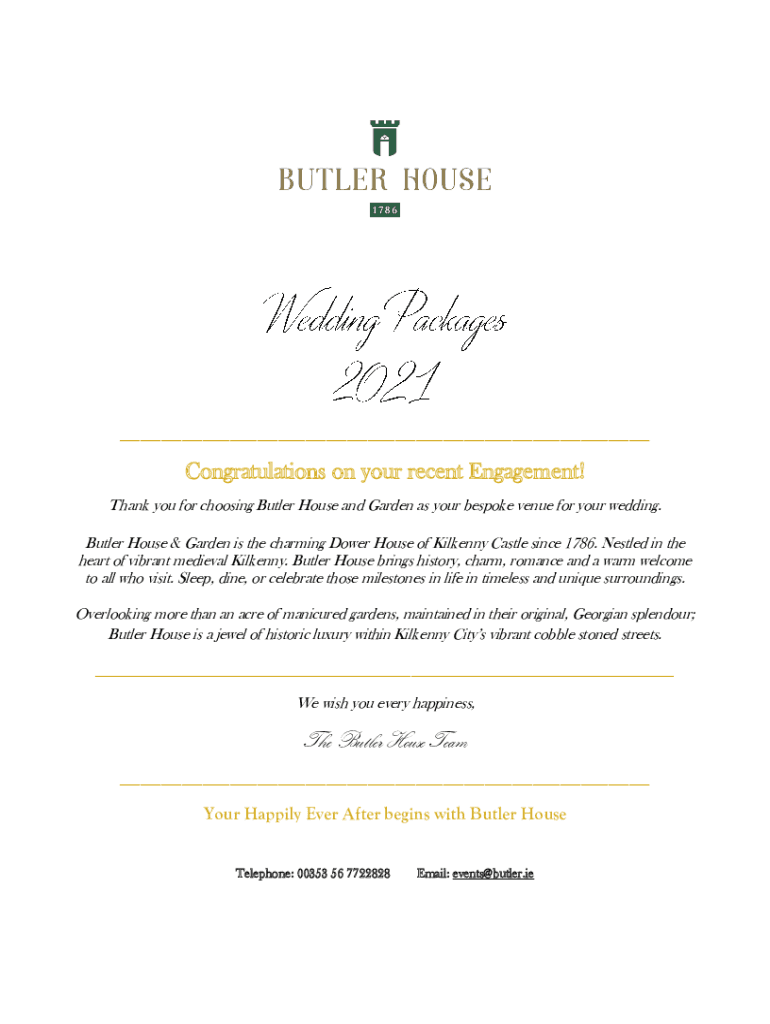 ___Congratulations on your recent Engagement! Thank you for choosing Butler House and Garden as your bespoke venue for your wedding. Butler House & Garden is the charming Dower House of Kenny Castle