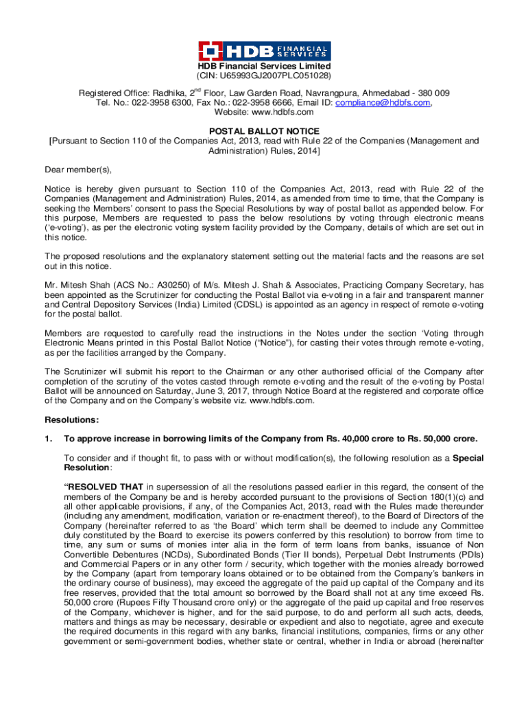HDB Financial Services Limited (IN: U65993GJ2007PLC051028) registered Office: Rashida, 2 Floor, Law Garden Road, Navrangpura, Ahmedabad 380 009 Tel. No.: 0223958 6300, Fax No.: 0223958 6666, Email