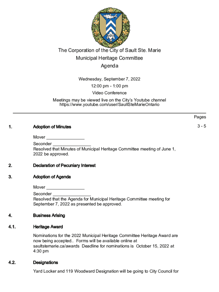 The Corporation of the City of Salt Ste. Marie Municipal Heritage Committee Agenda Wednesday, September 7, 2022 12:00 pm 1:00 pm Video Conference Meetings may be viewed live on the Cities YouTube