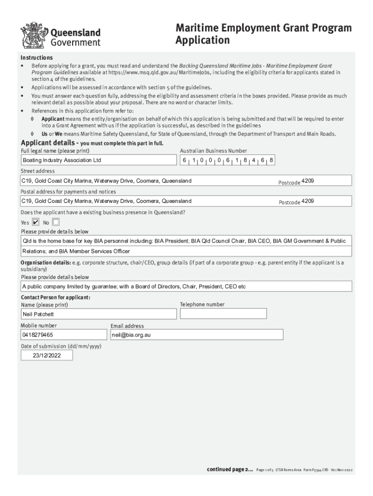 23 December 2022 Backing Queensland Marine Jobs Initiative BQMJ@msq.qld.gov.au cc., peter.g.wilkins@msq.qld.gov.au Dear Grants Team, I am writing on behalf of the Boating Industry Association Ltd
