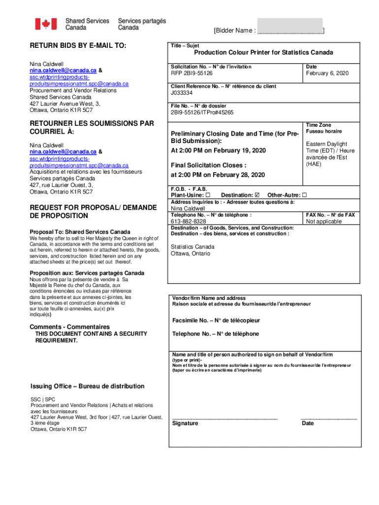 [Bidder Name : ___]RETURN BIDS BY EMAIL TO:Title SujetProduction Color Printer for Statistics Canada Nina Caldwell nina.caldwell@canada.ca & ssc.wtdprintingproductsproduitsimpressionatmt.spc@canada.ca