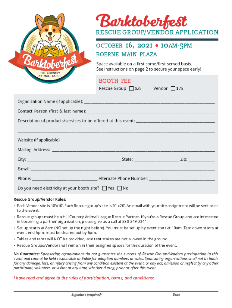 BarktoberfestRESCUE GROUP/VENDOR APPLICATION october16, 2021n10am5pmboerne main plaza Space available on a first come/first served basis. See instructions on page 2 to secure your space early!booth