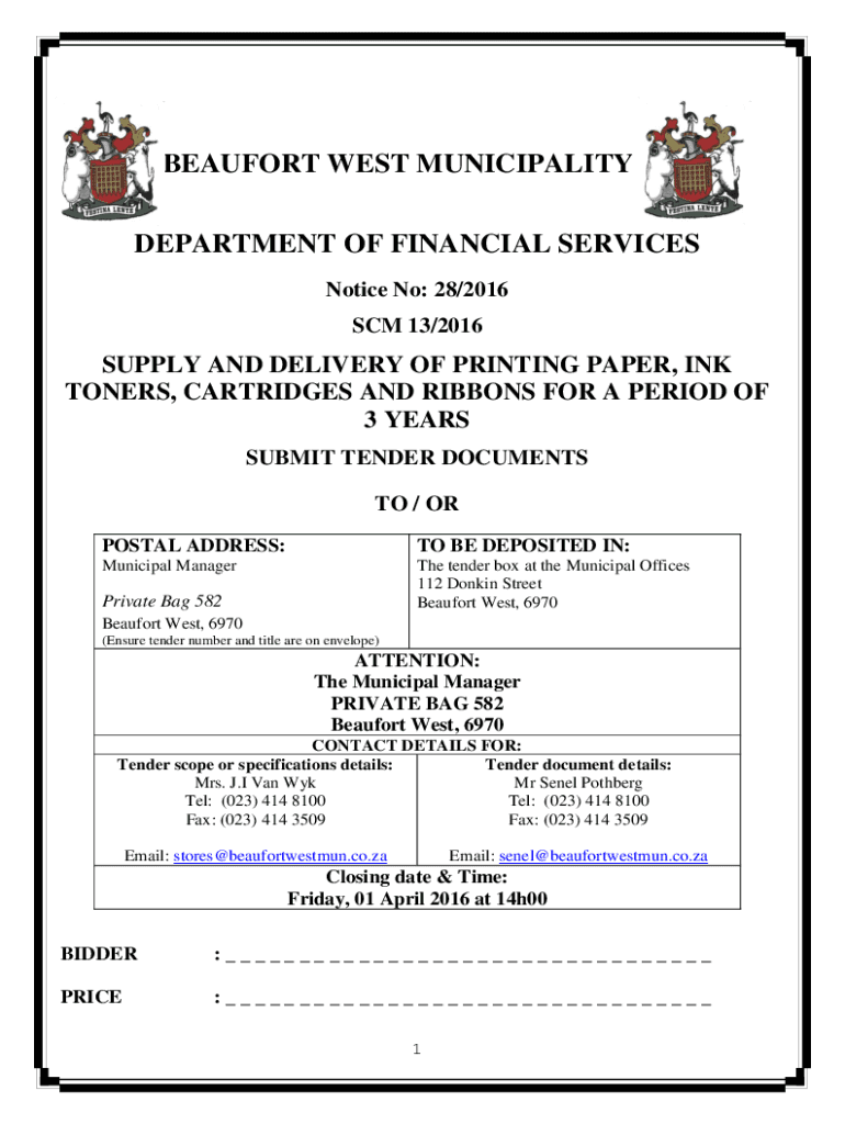 BEAUFORT WEST MUNICIPALITY DEPARTMENT OF FINANCIAL SERVICES Notice No: 28/2016 SCM 13/2016SUPPLY AND DELIVERY OF PRINTING PAPER, INK TONERS, CARTRIDGES AND RIBBONS FOR A PERIOD OF 3 YEARS SUBMIT TENDER